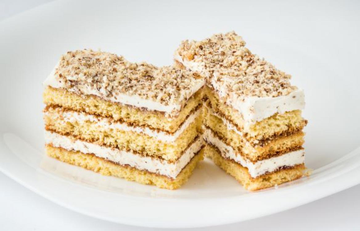 Šlehaný piškot, máslový krém s náhradními sladidly. Posypaný oříšky.